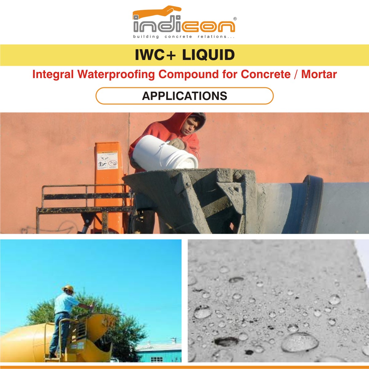 INDICON IWC+ Liquid is a light yellow colored, special waterproofing admixture. It is based on polymer, plasticizer with special chemicals, which when used as an admixture, forms an internal barrier against water penetration. It increases the plasticity of mortar, reduces water absorption.
