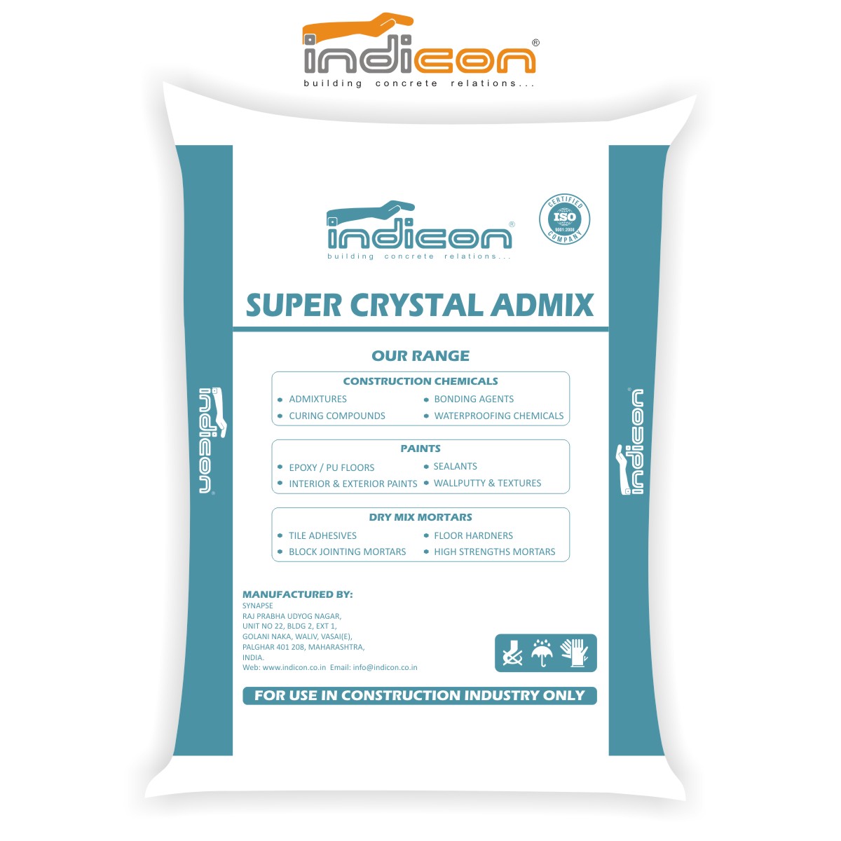 INDICON Super Crystal Admix is an economical, waterproofing admixture, manufactured in the form of dry powder. It is blend of portland cement, very fine treated silica sand and various active special chemicals. The active chemicals in It reacts with moisture, the alkali silicates combine with the water & free calcium particles forming crystals. Once the crystals have formed, they block pores and capillaries.