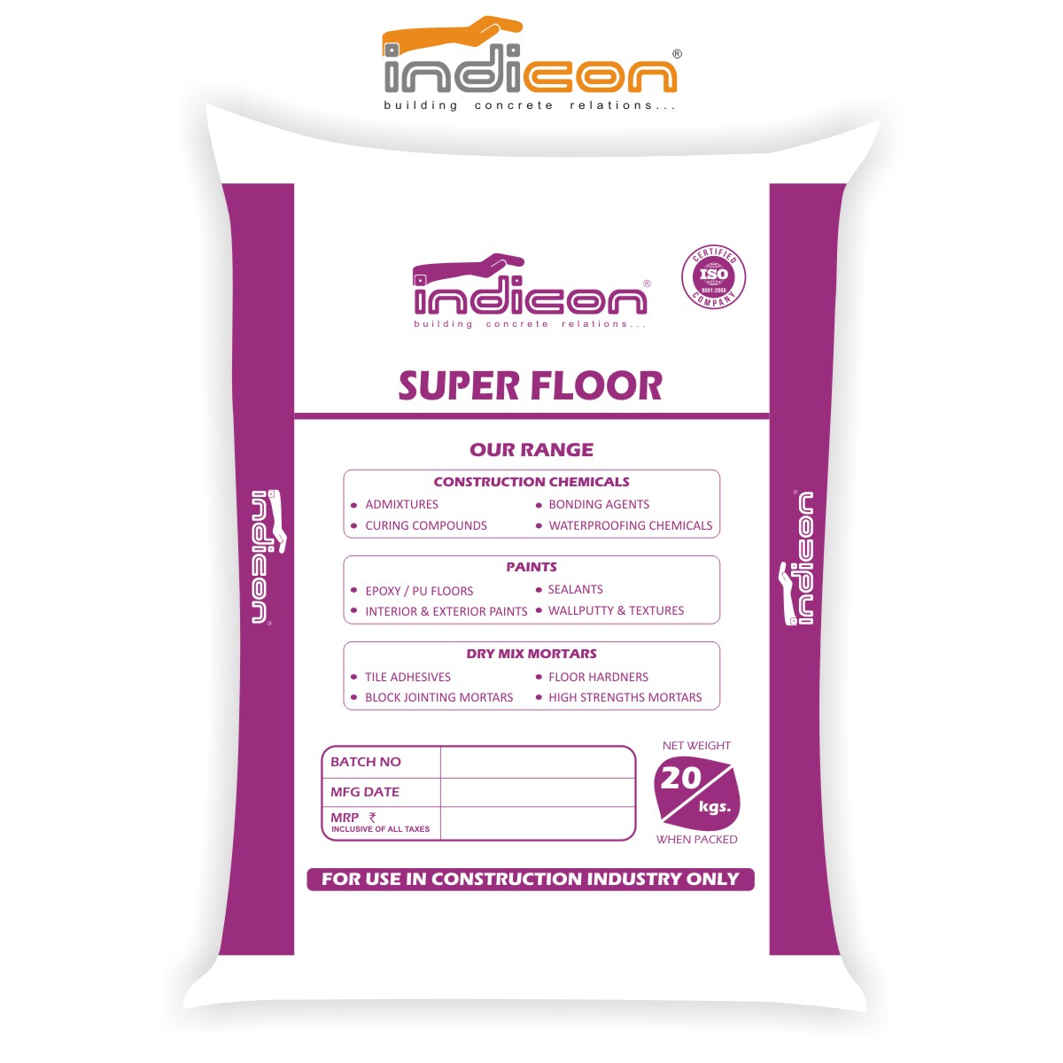 INDICON Super Floor is a mixture of graded, non metallic aggregate, binder and special additives. It is a ready to use shake-on floor hardener comprised of a blend of 100% pure emery. It is an economical concrete floor hardener. It is a grey colored free flowing powder. It is completely non corrosive and rust free and can be used inside or outside. It is applied on wet concrete by dry shake method in two broadcasts to harden and densify the surface. Then finish the surface by hand or machine trowelling. It hardens concrete in normal procedure. The wear /abrasion resistance of Super Floor will be 4-6 times more than plain concrete.