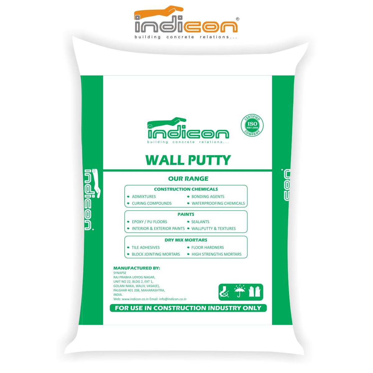 INDICON Wall Putty is white cement based powder blended with polymer and hydrophobic additives for application on masonry, concrete, plaster, gypsum surfaces. It has superior adhesive strength, durability and increases life of paints. It is water resistant and crack resistant to a certain degree. It renders a smooth and durable surface suitable for all kinds of paints. It also serves as filler/ leveler in the paint system.